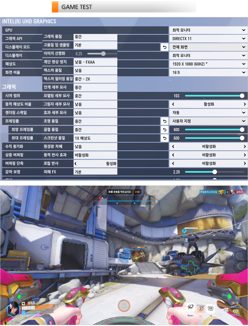 게임과는 거리가 먼 기업용 노트북이지만 기본적인 3D 체감성능을 확인하기 위해 게임을 실행해 보았다. 상단의 사진은 오버워치2를 이용해 프레임 테스트를 진행하고 있는 모습으로 중간 옵션에서 50-96 프레임을 보여주었다. (프레임은 높은 편이나 불규칙하게 프레임 드랍 현상이 발생했다. 메모리를 추가하면 이런 불편을 최소화 할 수 있을 것이다.)