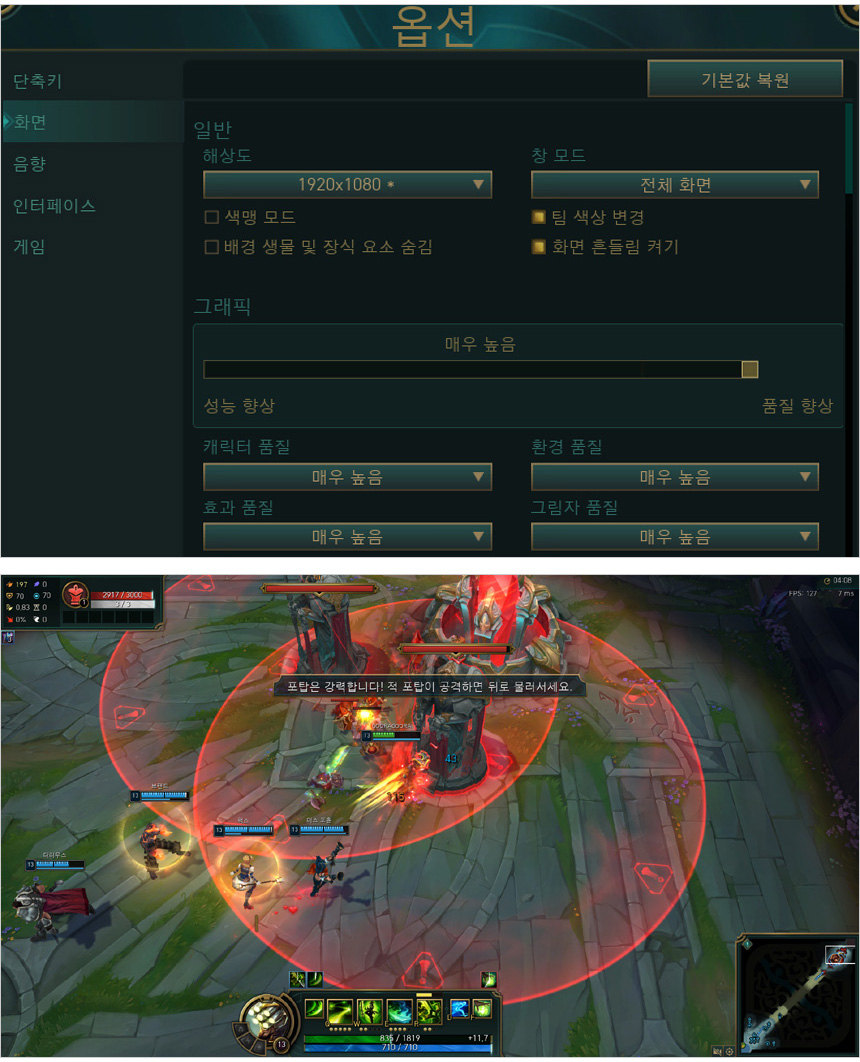 LOL을 매우 높음 옵션에서 실행하고 있는 모습으로 (연습모드) 106-152 프레임을 보여주어 부드럽게 게임을 즐길 수 있었다. 멀티 게임도 원활하게 플레이 할 수 있을 것이다.