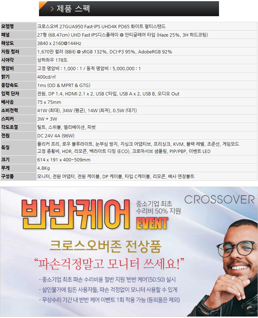 다재다능한 가성비 4K 게이밍 모니터, 크로스오버 27GUA950 Fast-iPS UHD4K PD65 화이트 멀티스탠드