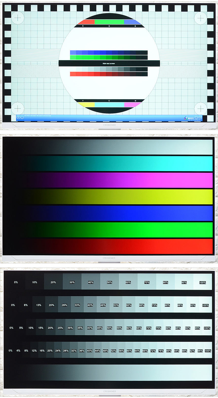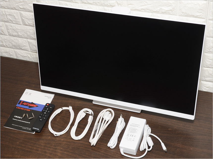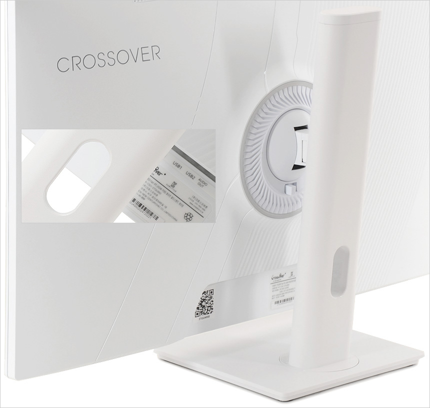 모니터 하단부의 모습으로 크로스오버 로고가 중앙에 세겨져 있으며 하단에는 OSD 버튼이 장착되어 모니터의 주요 기능을 손쉽게 조작할 수 있다. (참고로 리모콘을 기본 제공해 편의성을 높였다.) 또한 통풍구가 설치되어 있고 두 개의 3W 스피커가 장착되어 시원한 사운드를 즐길 수 있다.