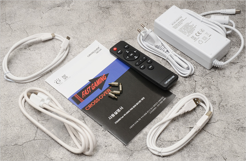 풀KIT 의 모습으로 다양한 기능을 지원하는 고급형 게이밍 모니터 답게 다양한 액세서리가 기본 제공된다. PD충전을 위해 96W 전원 어댑터를 제공하며 전원 케이블과 DP케이블, C타입과 B타입 USB 케이블이 포함되어 있다. 또한 무선 리모콘과 설명서, 베사 연장볼트도 지원하는 것을 확인할 수 있다.