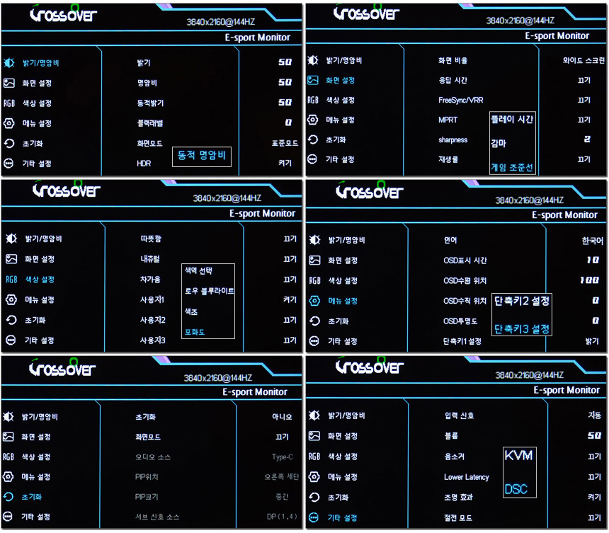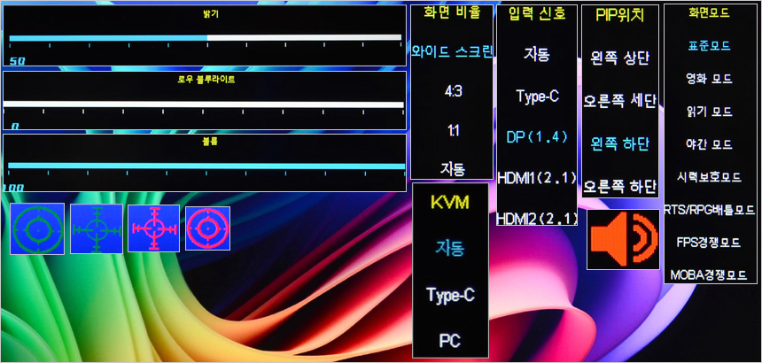 OSD에서 모니터를 사용자에 맞게 설정할 수 있다. 특히 리모콘을 제공해 편의성을 높였으며 핫키를 지원해 입력소스, 화면비율, 조준선, 볼륨, 화면모드, 블루라이트, KVM 등을 빠르게 설정할 수 있다.