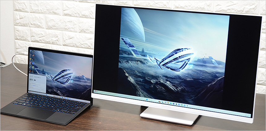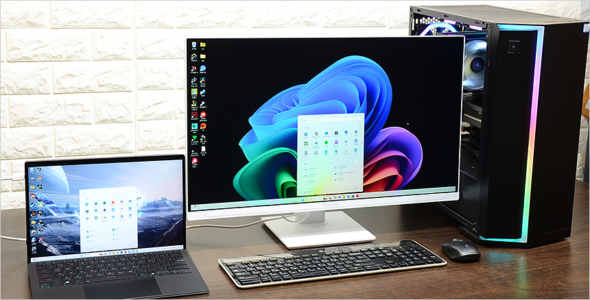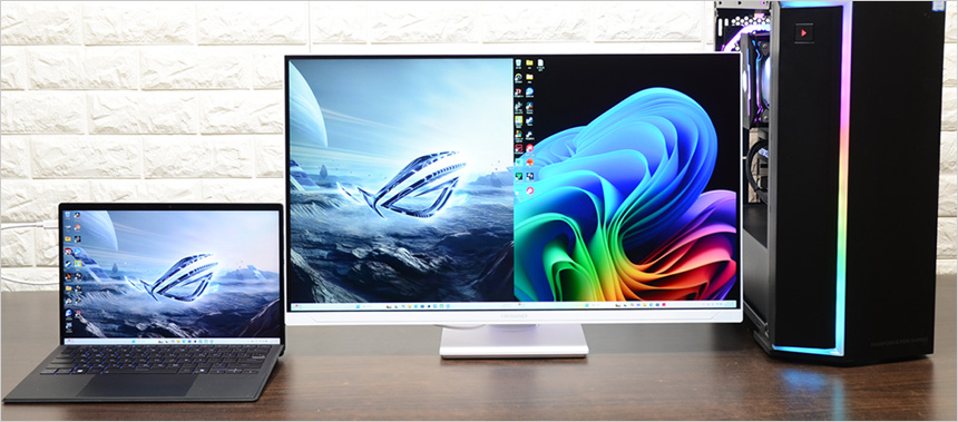 모니터를 책상에 설치한 모습으로 27형 모델답게 많은 공간을 차지하지 않았다. 집이나 사무실의 책상 공간이 협소 하더라도 설치에 어려움은 없을 것이다. 다양한 단자를 지원해 PC는 물론 노트북이나 스마트폰, 게임콘솔, OTT 플레이어 등 다양한 디바이스와 연결할 수 있으며 KVM 기술을 지원해 USB 단자를 다용도로 활용할 수 있다.