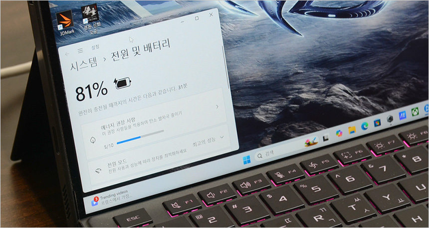 C타입 단자를 제공할 뿐만 아니라 PD충전을 지원해 C타입 케이블 연결만으로 노트북과 스마트폰의 충전이 가능하다. 상단의 사진은 PD충전을 지원하는 노트북과 연결한 모습으로 화면 출력과 충전이 동시에 이루어지는 것을 확인할 수 있었다. @ 참고로 노트북은 C타입 디스플레이 출력과 PD충전을 지원해야 한다.