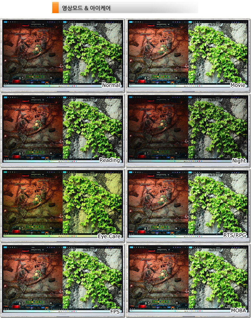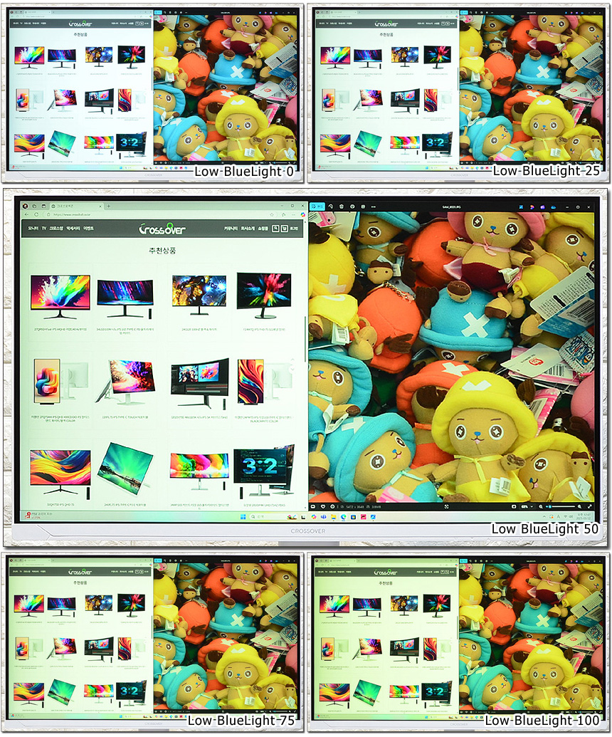 눈건강을 해치는 블루라이트 감소 기능을 제공한다. 상단의 사진은 단계별 영상의 모습으로 설정값에 따라 차이가 발생하는 것을 확인할 수 있다. (리모콘에서 핫키를 지원해 빠른 설정이 가능하다.)