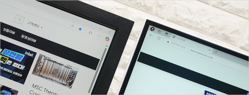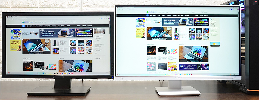 두 대의 모니터를 셋팅한 김에 두 제품의 베젤 두께를 비교해 보았는데 확연한 차이가 발생하는 것을 확인할 수 있었다. 두꺼운 베젤로 인한 거슬림 없이 영상에 몰입하고 싶다면 좋은 선택이 될 것이다.
