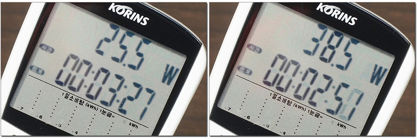 소비전력 테스트를 진행하고 있는 모습으로 100% 밝기에서는 38.5W 소비전력을 보여주었으며 50% 밝기에서는 25.5W로 소비전력이 낮아지는 것을 확인할 수 있었다. (해상도 대비 소비전력이 낮은 편이다. 60% 밝기로만 설정해도 대부분의 게임을 원활하게 즐길 수 있었다.)