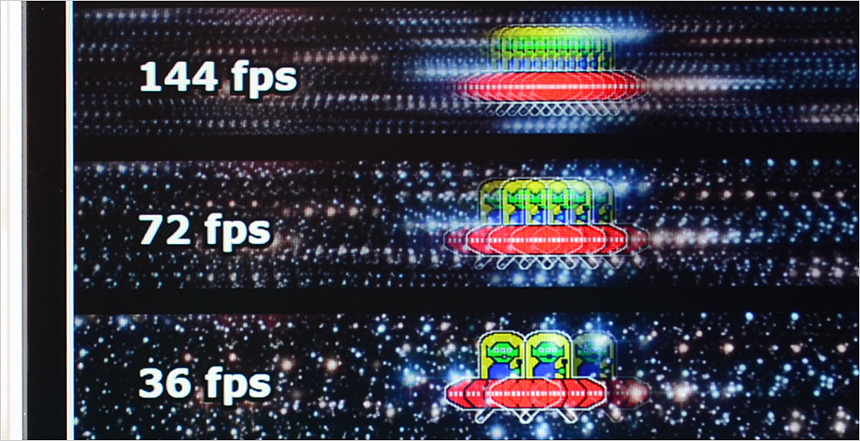 144Hz 주사율을 지원해 깔끔하게 FPS 게임을 즐길 수 있다. 상단의 사진은 144Hz 주사율을 쉽게 확인할 수 있도록 하위 프레임과 같이 재생되는 영상 (960 Pixel Per Sec) 을 셔터스피드 1/20 로 촬영한 모습으로 프레임이 높아질수록 시간당 많은 화면이 뿌려지기 때문에 캐릭터의 수가 많은 것을 확인할 수 있다. 직접 눈으로 영상을 볼 경우 144Hz가 하위 프레임 대비 자연스럽게 움직인다.