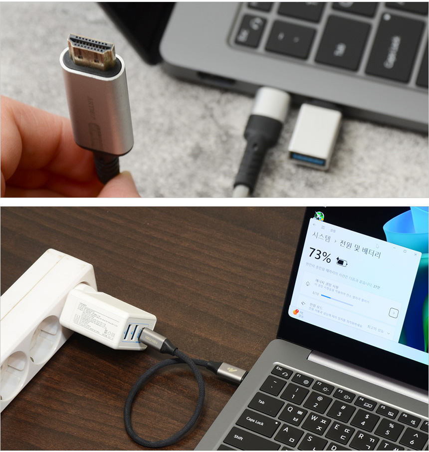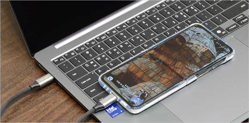 썬더볼트 4 단자는 상시전원을 지원해 노트북이 꺼진 상태에서도 스마트폰을 충전할 수 있다. (삼성 셋팅에서 기능을 활성화 해야 한다.) 집이나 회사에서 충전기를 찾아다닐 필요가 없다.