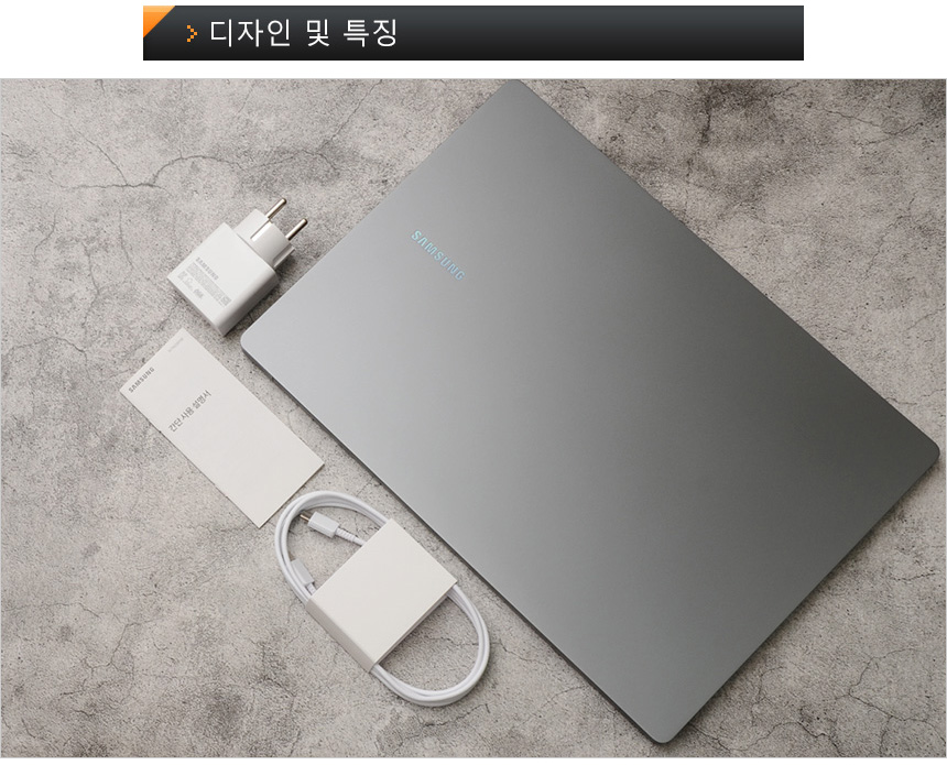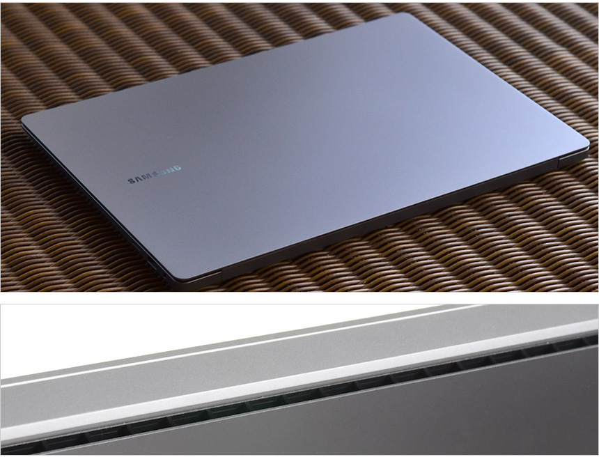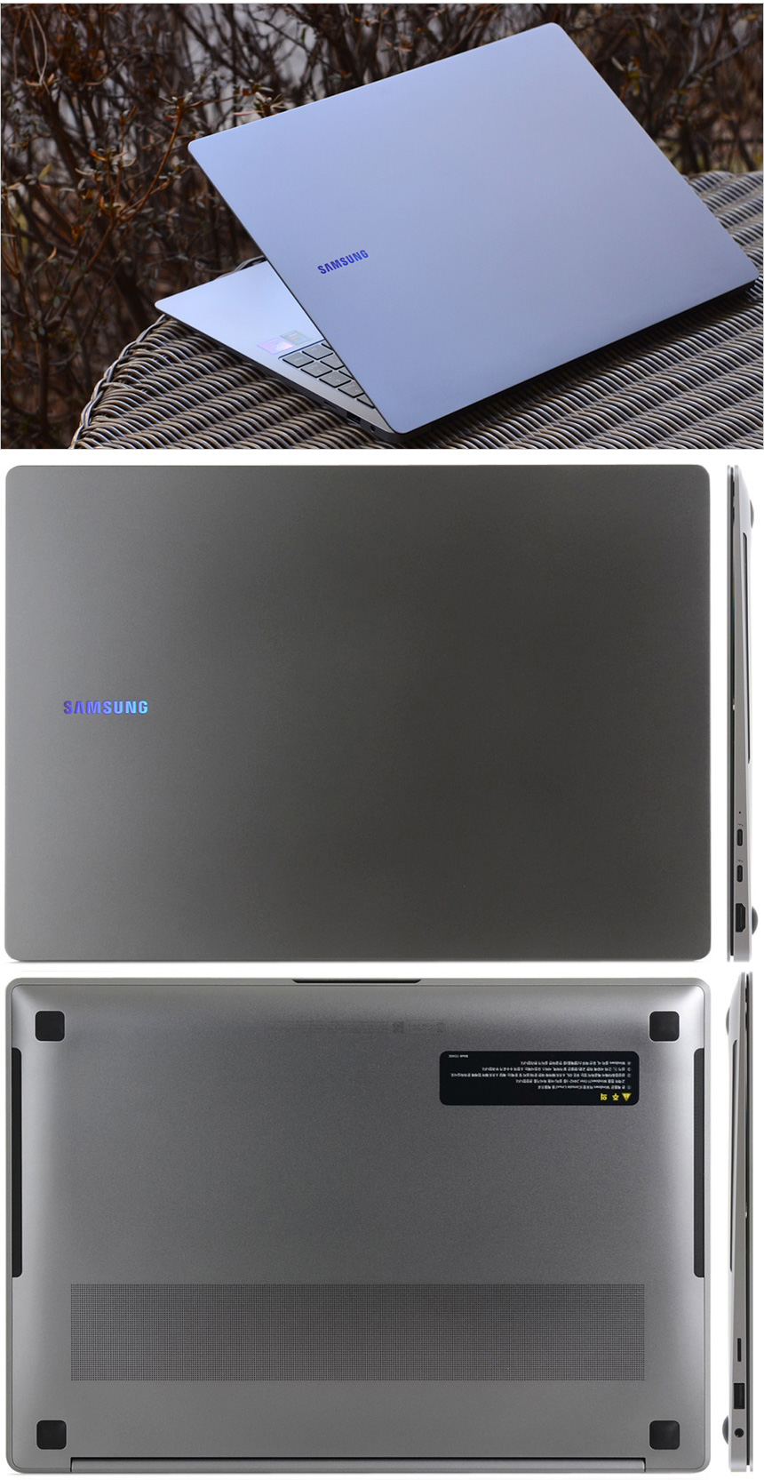 노트북의 디자인은 기존 갤럭시북 시리즈와 같이 고급스러운 것을 확인할 수 있다. 중후한 그레이 컬러로 출시되며 알루미늄 소재를 사용해 좋은 질감을 제공하는 것은 물론 높은 내구성을 구현하며 로고 부분에는 홀로그램을 적용해 포인트를 주었다. 최고 수준의 마감 완성도를 보여주는 노트북으로 보급형이나 가성비 제품들과는 완성도에서 분명한 차이를 경험할 수 있을 것이다.
