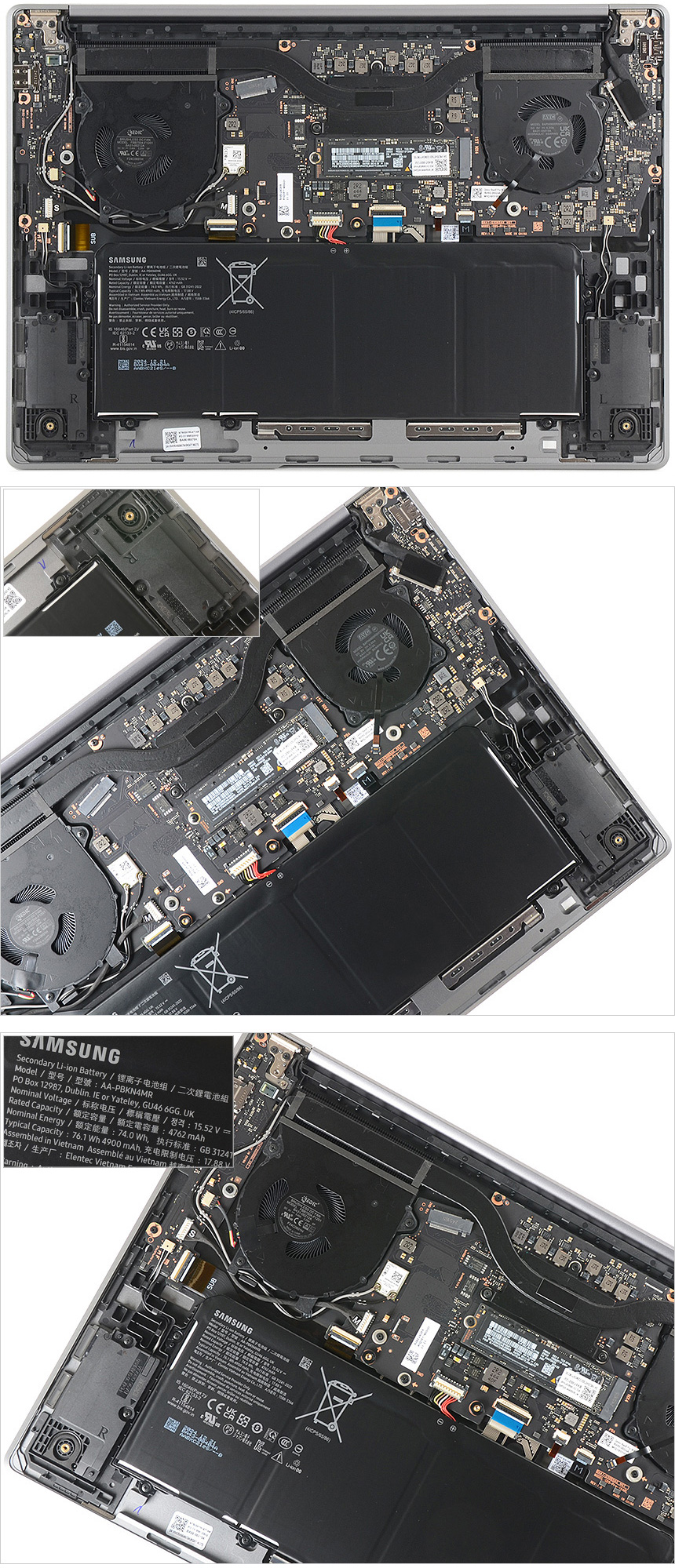 바닥면 내부의 모습으로 전문작업에서 스로틀링 없이 고성능을 유지할 수 있도록 듀얼팬이 설치된 것을 확인할 수 있다. 또한 하단에는 76Wh (4900mAh) 리튬이온 배터리가 설치되어 있고 마드네틱과 스피커가 장착된 것도 알 수 있다.