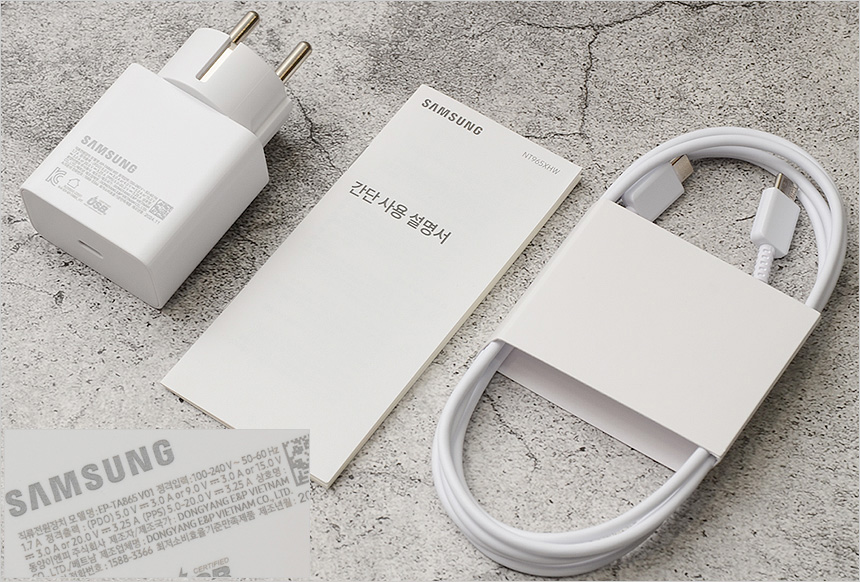 풀KIT 의 모습으로 노트북을 비롯해 C타입의 65W 전원 어댑터와 충전 및 데이터 전송을 위한 C타입 케이블이 제공되며 퀵 매뉴얼이 포함된 것을 확인할 수 있다.