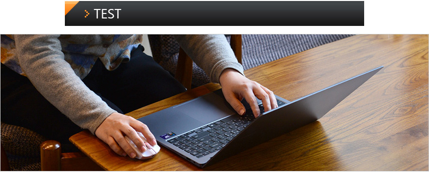 타이핑 테스트를 진행하고 있는 모습으로 키간격이 넓어 오타없는 고속 타이핑이 가능했으며 슬림 키캡 사용으로 깊은 눌림은 제공하지 않지만 구분감은 확연해 눈으로 확인하지 않고도 원할하게 타이핑을 할 수 있었다. 뿐만 아니라 엄청나게 넓은 팜래스트 지원으로 손 뿐만 아니라 손목까지 안정적으로 받쳐놓은 상태에서 편하게 노트북을 사용할 수 있었다.