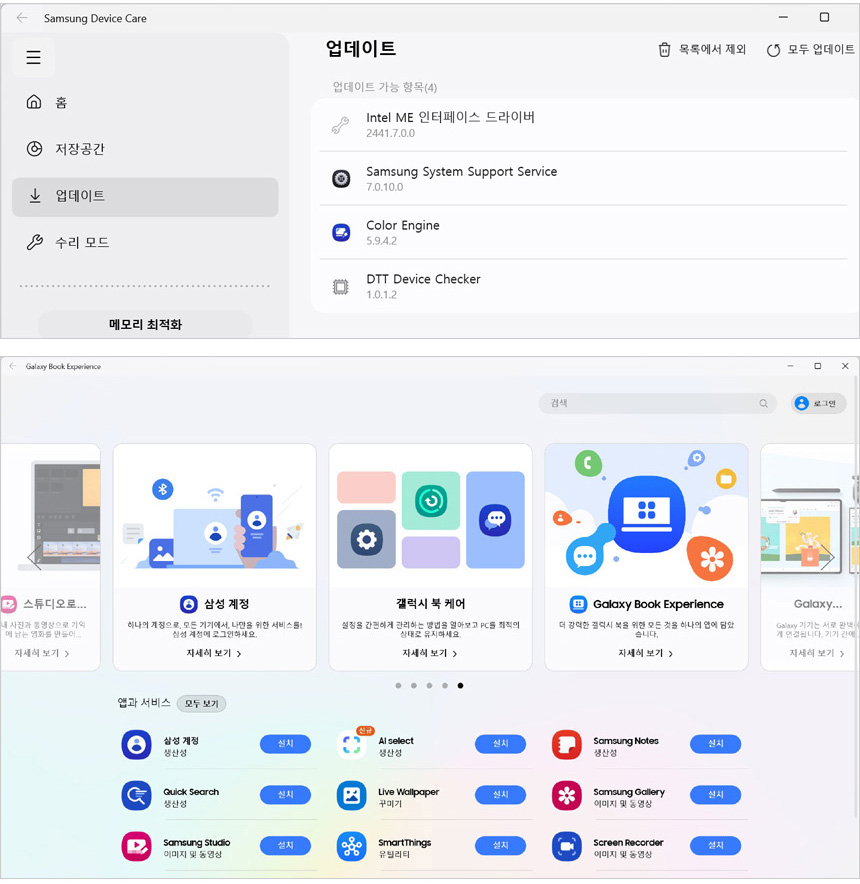 드라이버 까지 설치후 윈도우키 + I 를 눌러 최신으로 윈도우를 업데이트 해 준후 삼성 디바이스 케어를 설치해 노트북 업데이트를 진행하기 바란다. (삼성 업데이트 앱이 삼성 디바이스 케어로 이동했다.) 마지막으로 갤럭시북 익스피리언스를 실행하면 삼성에서 제공하는 다양한 S/W를 취향에 따라 설치할 수 있다.