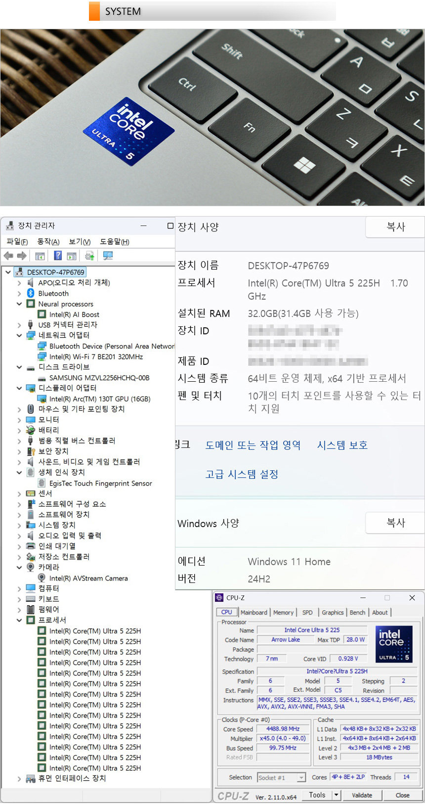 시스템 정보를 확인하고 있는 모습으로 4개의 성능코어와 8개의 효율코어에 2개의 초저전력 코어로 구성되어 있고 인텔 NPU도 적용되어 CPU 사용율과 전력소모를 최소화 하는 동시에 윈도우 기반의 AI 처리속도를 한층 향상 시킨 애로우레이크 225H 프로세서가 장착된 것을 확인할 수 있다.