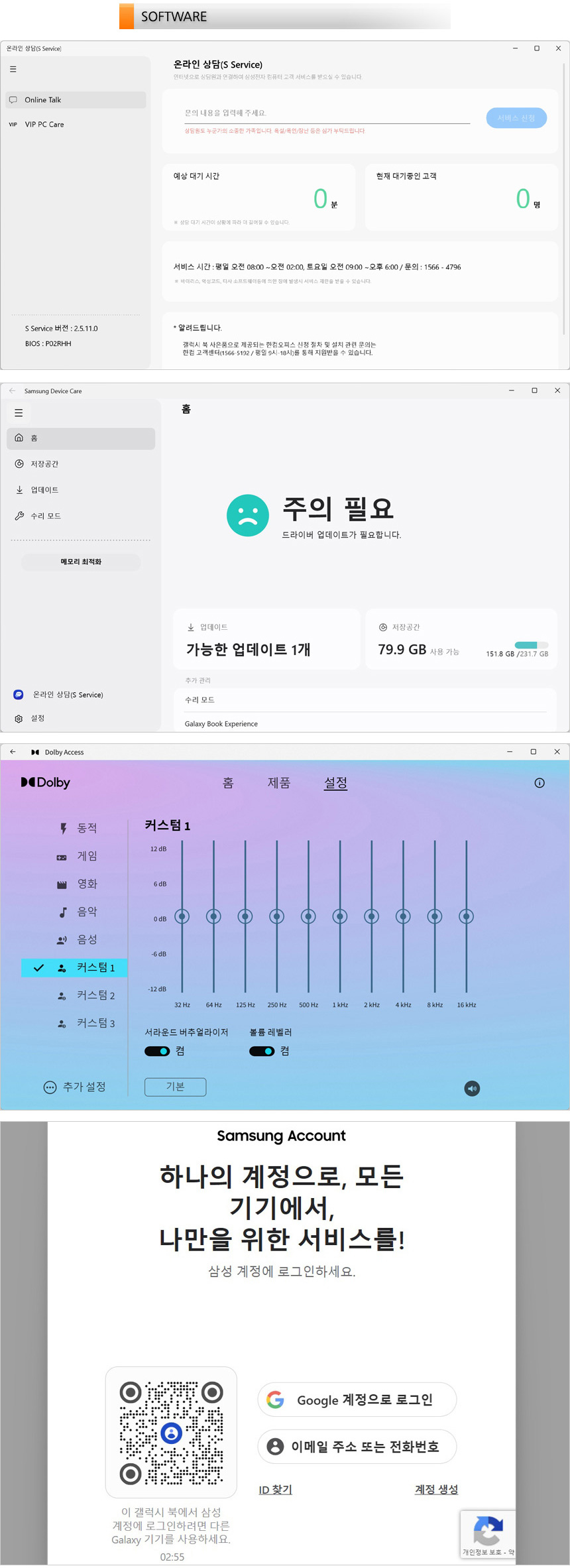 애플리케이션의 모습으로 온라인 상담을 지원해 노트북에 문제가 발생했을 때 빠르게 조치를 받을 수 있으며 돌비 애트모스 지원으로 사용자에 맞는 최적의 음색을 설정할 수 있다. 또한 삼성전화나 멀티 컨트롤은 삼성 계정을 등록해야 작동하는데 사용자의 불편을 최소화 하기 위해 삼성 어카운트에서 QR코드 로그인을 제공하며 삼성 디바이스 케어를 통해 노트북을 손쉽게 관리할 수 있다. (기본 제공되는 S/W가 아주 많다. 필요한 S/W 는 갤럭시북 익스피리언스에서 설치하기 바란다.)