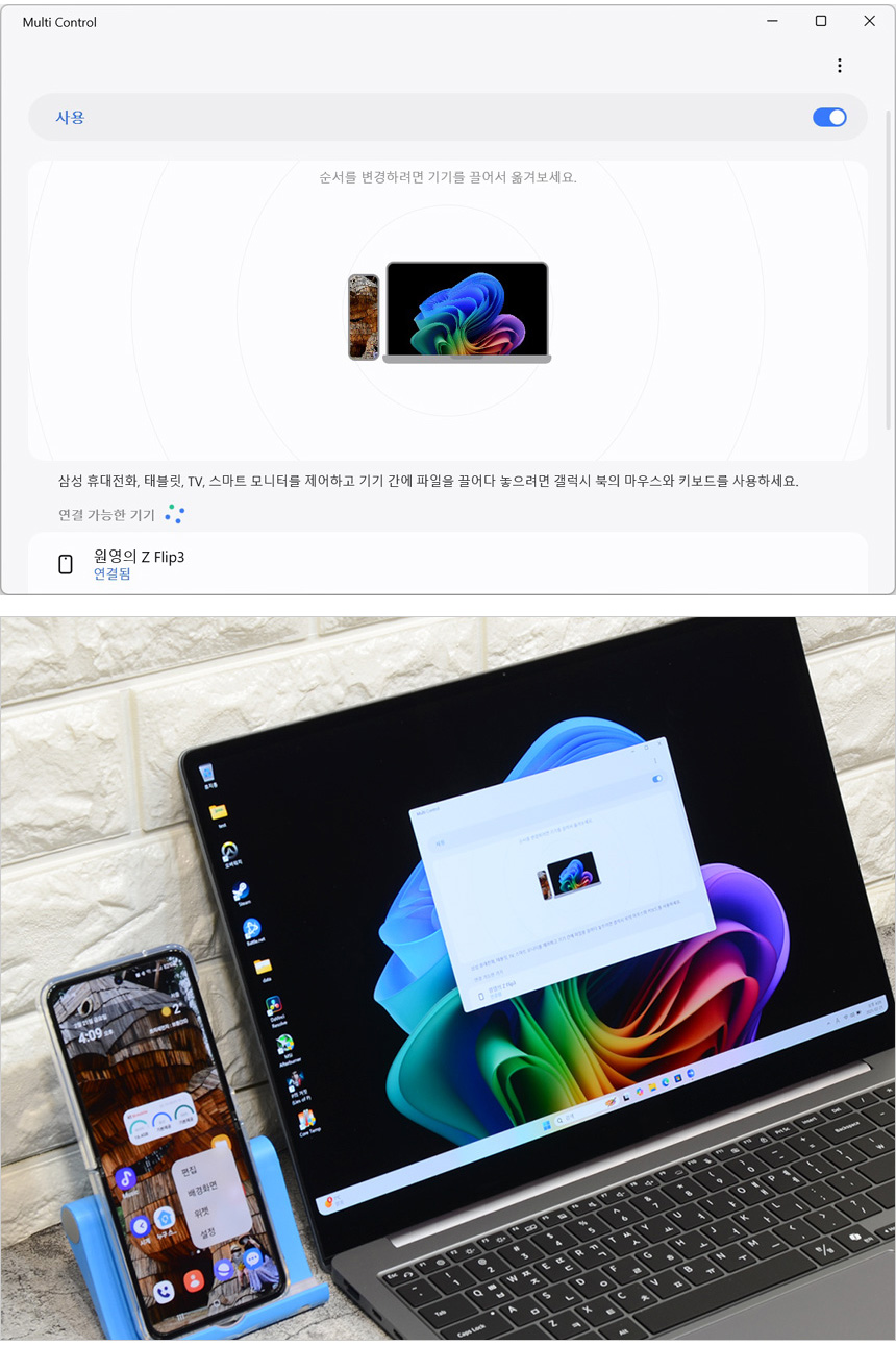 노트북 키보드와 연결된 마우스를 스마트폰에서도 사용할 수 있는 멀티 컨트롤 기능을 제공한다. 상단의 사진은 멀티 컨트롤을 테스트 하고 있는 모습으로 듀얼 모니터를 사용한 듯 자연스럽게 마우스 커서가 이동하는 것을 확인할 수 있었다. (KVM 과 달리 디바이스 변경을 위한 단축키도 누를 필요가 없다.) 텍스트 등을 복사에 기기간 붙여넣기도 할 수 있어 유용하게 활용할 수 있을 것이다. @ 동영상을 확인하기 바란다.