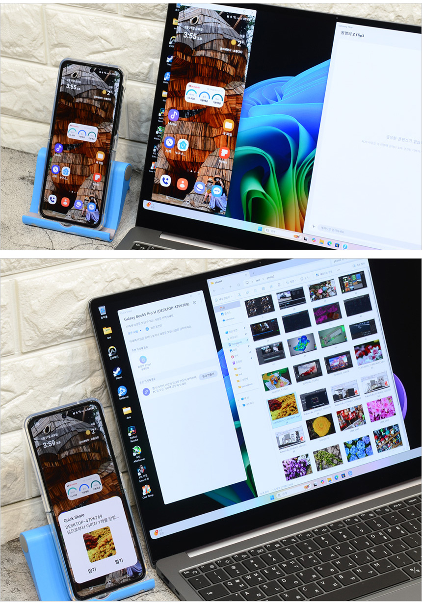 삼성 플로우를 사용하면 노트북에서 스마트폰을 컨트롤 할 수 있으며 무선으로 스마트폰과 간단하게 사진이나 영상, 파일을 전송할 수 있는 Quick Share를 지원해 유용하게 활용할 수 있다. 뿐만 아니라 태블릿과 연결해 화면을 공유할 수 있는 Second Screen을 통해 작업 효율성을 높일 수 있다.