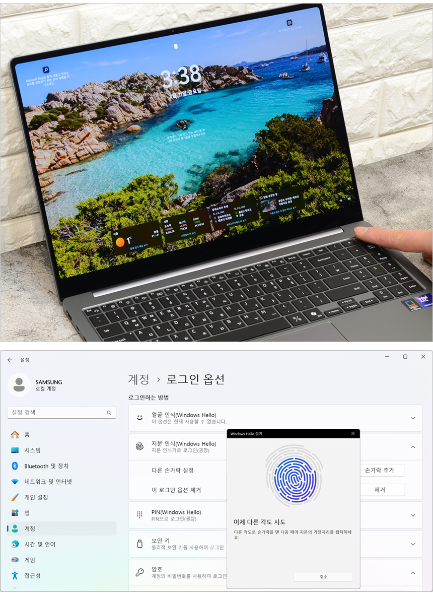 전원 버튼에 지문인식 센서를 탑재해 높은 보안성과 편의성을 경험할 수 있다. 특히 삼성 녹스 보안 솔루션 까지 추가된 노트북으로 높은 보안이 필수적인 비즈니스 노트북으로도 손색이 없다.
