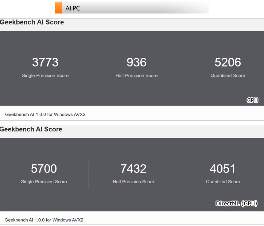 AI 전용 벤치마크 툴을 이용해 AI 성능 테스트를 진행하고 있는 모습으로 AI 에 특화된 CPU가 탑재된 모델답게 높은 스코어를 보여주었다. (16GB 모델대비 CPU 스코어의 확연한 상승이 눈에 띈다.)