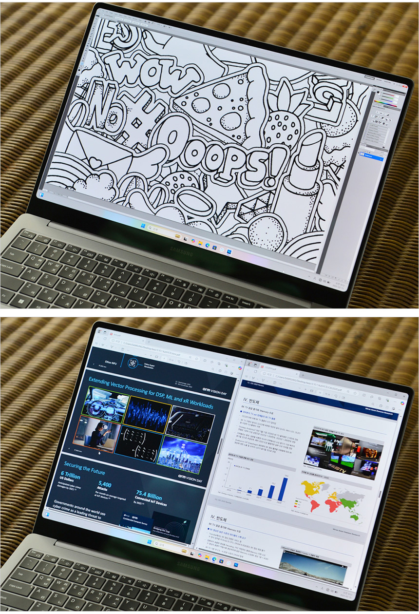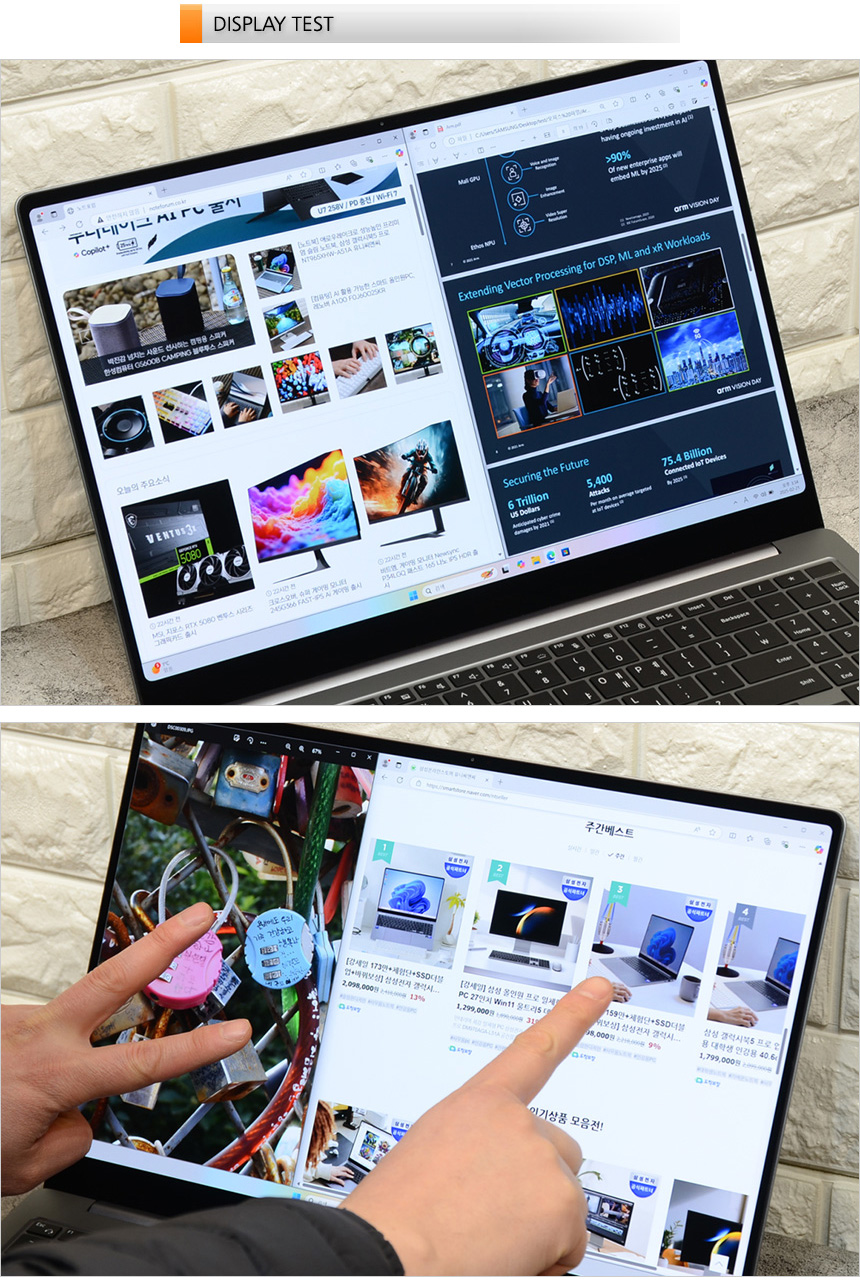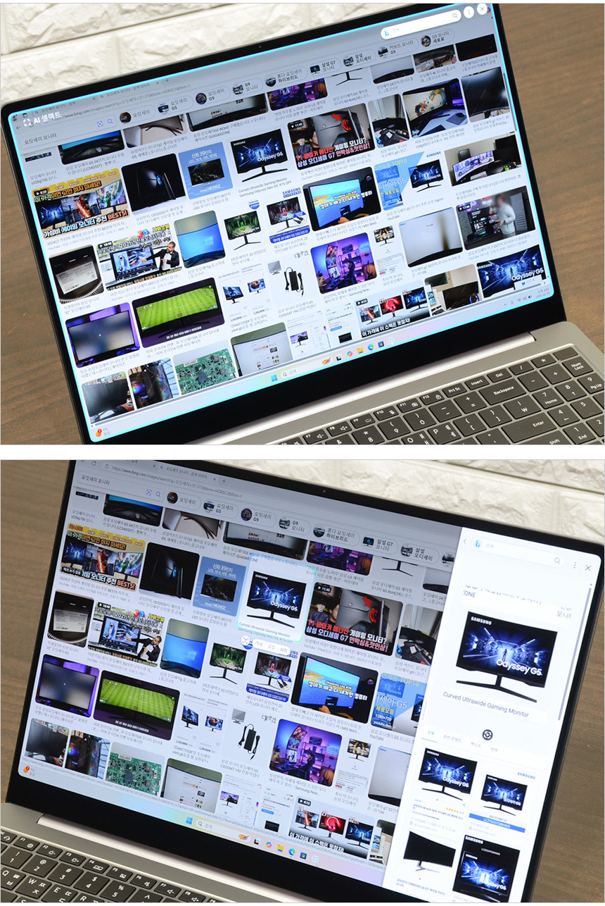 터치를 적용해 편의성과 활용성을 높인점은 갤럭시북 프로 시리즈의 큰 장점중 하나라 할 수 있다. 마우스를 사용하기 힘든 외부에서는 (공공장소나 협소한 책상이 놓여있을 경우) 빠른 노트북 조작이 힘든데 이 제품은 터치 디스플레이를 지원해 마우스 수준의 빠른 조작이 가능하며 테스트 부분에서 설명드릴 AI 셀렉트를 편하게 활용할 수 있다.