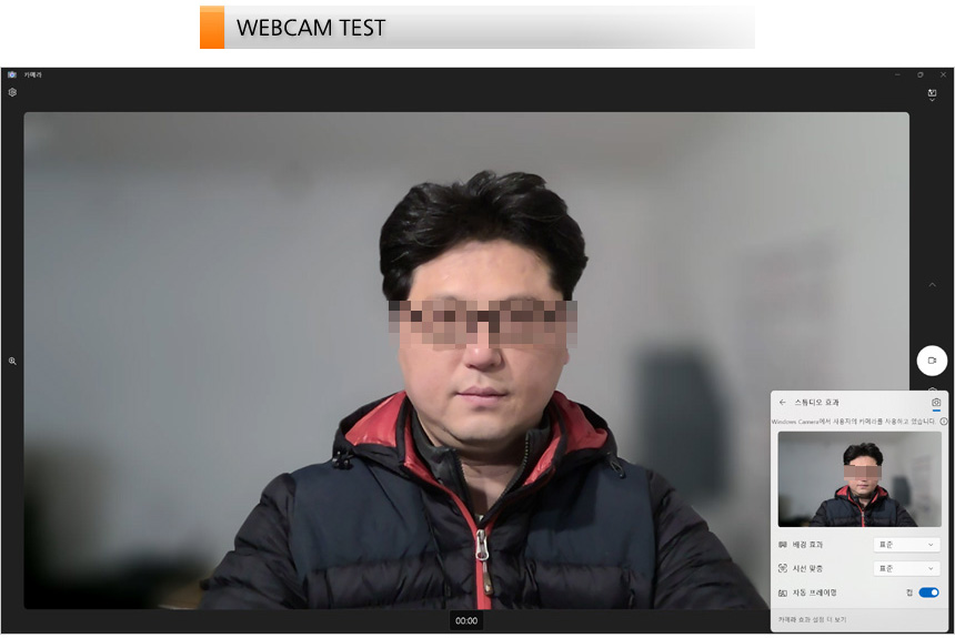 웹캠의 화질을 확인하고 있는 모습으로 2MP 해상도를 지원해 HD 웹캠과는 확연히 비교되는 디테일과 색감을 보여주었다. (삼성 특유의 부드러운 피부톤 표현은 여전하다.) 특히 스튜디오 효과를 사용하면 배경을 날려 버리거나 사용자에게 화면이 맞춰지는 자동 프레이밍 등을 활용할 수 있어 화상화의 등에서 편하게 사용할 수 있다.