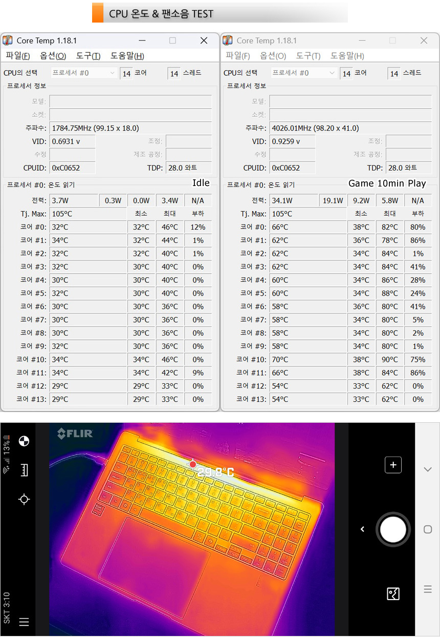 또한 열화상 카메라를 이용해 게임 실행중 열분포를 확인하고 있는 모습으로 CPU가 설치된 키보드 중앙부를 중심으로 열이 퍼져나가며 열이 빠져 나가는 통풍구 부분의 온도가 가장 높은 것을 확인할 수 있다. 팜래스트의 온도는 상당히 낮아열로 인한 스트레스 없이 손을 올려두고 사용할 수 있다.