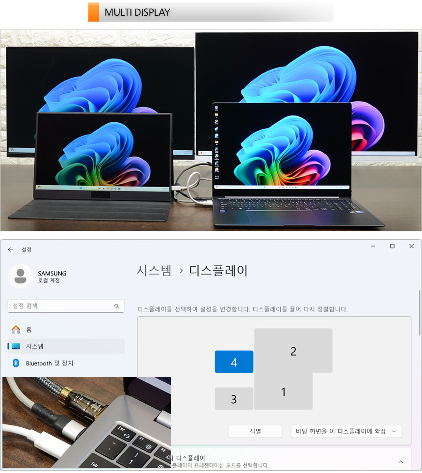썬더볼트 4 단자가 디스플레이 출력을 지원해 HDMI를 포함한 2개의 모니터를 추가할 수 있다. 상단의 사진은 멀티 디스플레이 테스트를 진행하고 있는 모습으로 원활하게 작동하는 것을 확인할 수 있었다. (노트북 포함 3개의 모니터 사용이 가능한 루나레이크와 달리 4개의 모니터 활용이 가능하다. 멀티테스킹이 필수라면 애로우레이크 탑재 노트북이 좋은 대안이 될 것이다.)