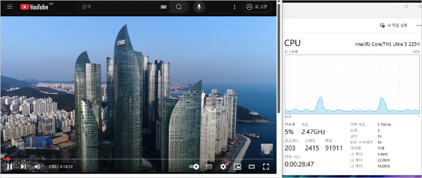 유튜브 고화질 동영상을 이용해 CPU 점유율을 테스트 하고 있는 모습으로 (2160P@60FPS) 5-24% 대의 점유율을 보여 주었으며 인터넷을 실행했을 때 30% 중반까지 점유율이 올라가는 것을 확인할 수 있었다.
