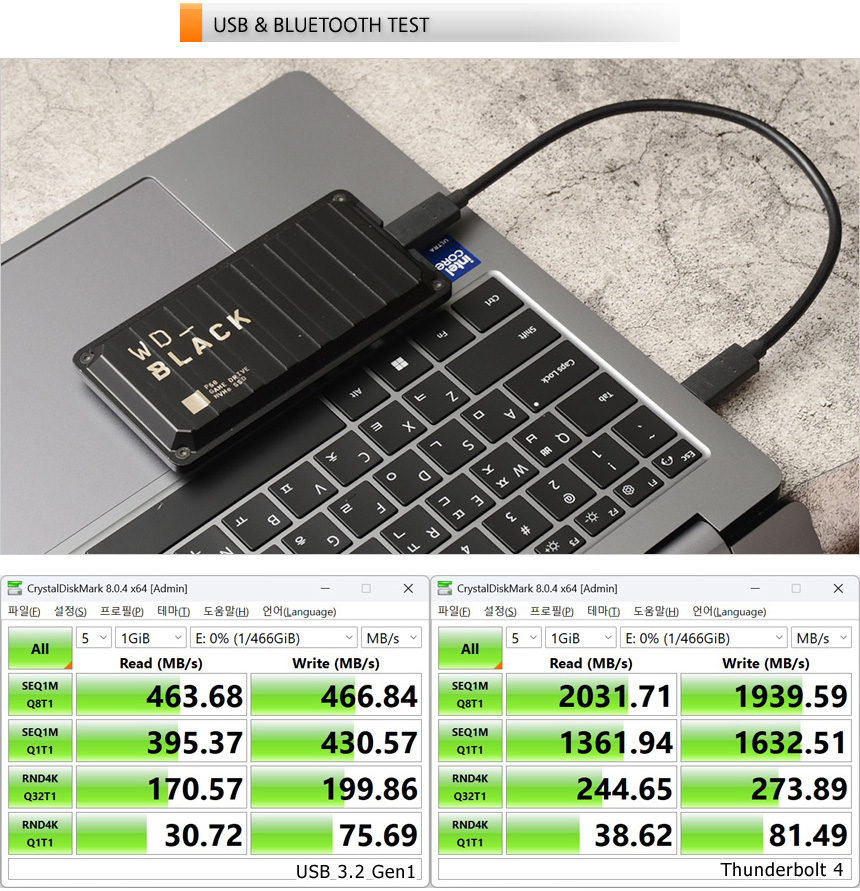 썬더볼트 4 단자를 지원해 빠른 데이터 전송이 가능하다. 상단의 사진은 외장 SSD (USB 3.2 Gen2x2 지원제품) 를 이용해 테스트를 진행하고 있는 모습으로 USB 3.2 Gen1과 확연한 차이를 보여주었다. 대용량 데이터 전송이 잦은 유저들이라면 만족하며 사용할 수 있을 것이다.