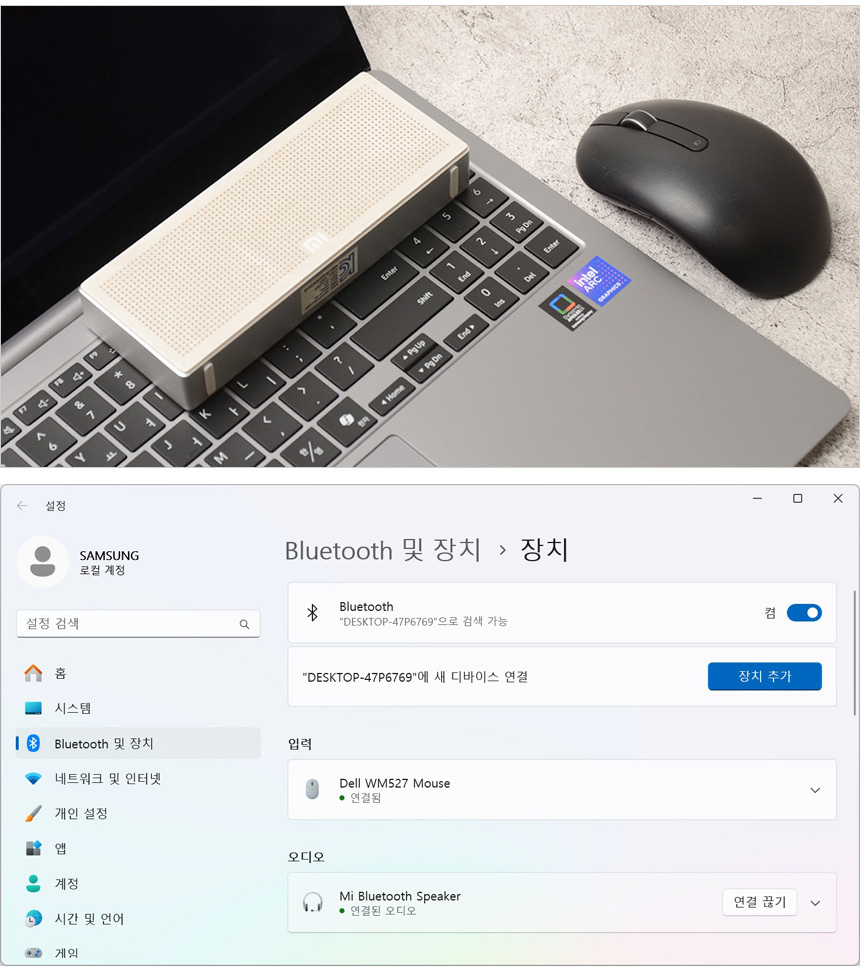 블루투스를 지원해 다양한 액세서리를 무선으로 연결해 활용할 수 있다. 상단의 사진은 외장 스피커나 마우스 페어링 테스트를 진행하고 있는 모습으로 원활하게 연결되는 것을 확인할 수 있었다.