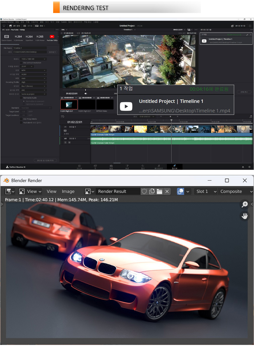 영상편집 S/W 다빈치 리졸브를 이용해 랜더링 테스트를 진행하고 있는 모습으로 (640MB, 920MB, 990MB 4K 동영상을 단일 동영상으로 랜더링, FHD 해상도에 H.264 비디오 코덱) 4분 16초가 소요되는 것을 확인할 수 있었으며 블랜더 랜더링 테스트에서는 2분대의 빠른 랜더링 시간을 보여주었다. @ 16GB 메모리 모델대비 영상편집 랜더링은 44초 단축 되었으며 블랜더 랜더링 시간은 15초 단축 되었다.