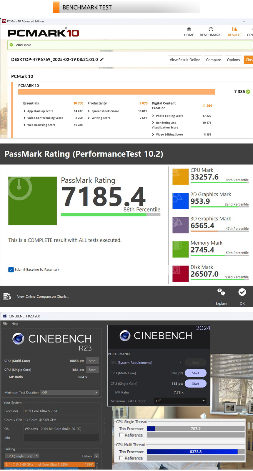 벤치마크 테스트를 진행하고 있는 모습으로 문서작업 뿐만 아니라 고성능을 필요로 하는 전문작업용 S/W도 부드럽게 실행할 수 있는 스코어를 보여주었다. 게이밍이나 크리에이터 노트북 수준은 아니지만 성능으로 인한 스트레스 없이 사용할 수 있을 것이다.