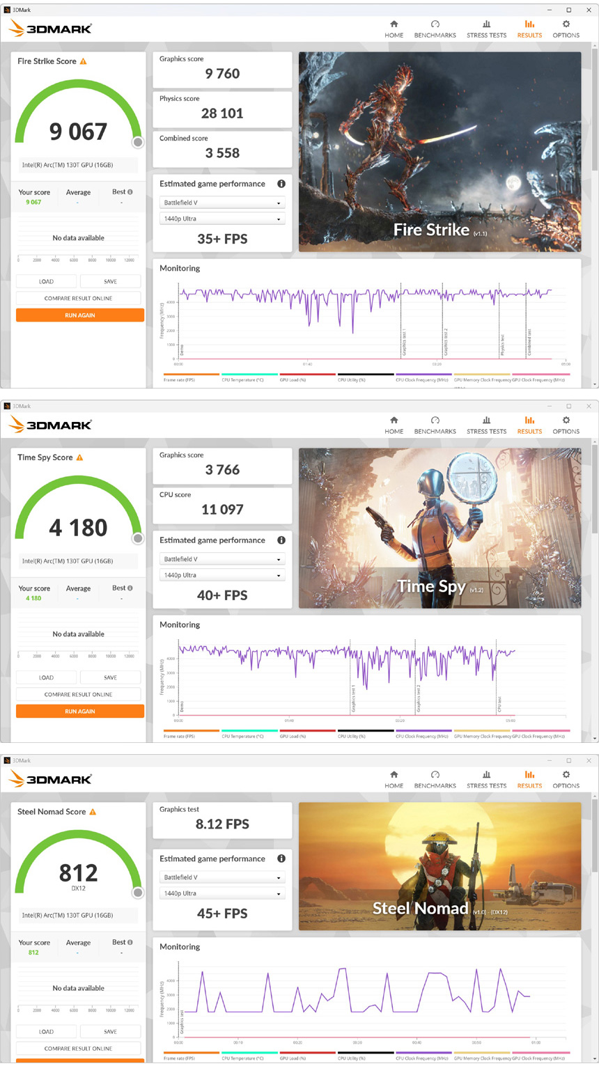 3DMARK를 이용해 3D 성능을 확인하고 있는 모습으로 인텔 아크 내장그래픽이 적용된 모델답게 스코어가 상당히 높은 것을 확인할 수 있다. 캐주얼한 3D 게임 뿐만 아니라 일부 최신 게임도 옵션 조정을 통해 즐길 수 있다. (16GB 메모리 탑재 모델대비 모든 스코어가 높아졌다.)