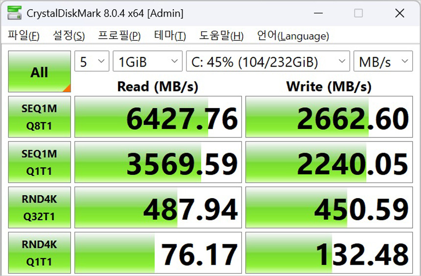 저장장치의 속도를 확인하고 있는 모습으로 PCIe 4.0 NVMe SSD를 탑재해 일반 노트북과 확연히 비교되는 빠른 속도를 경험할 수 있다. (단, 용량이 256GB 이기 때문에 추가 장착이나 업그레이드가 필요하다.)