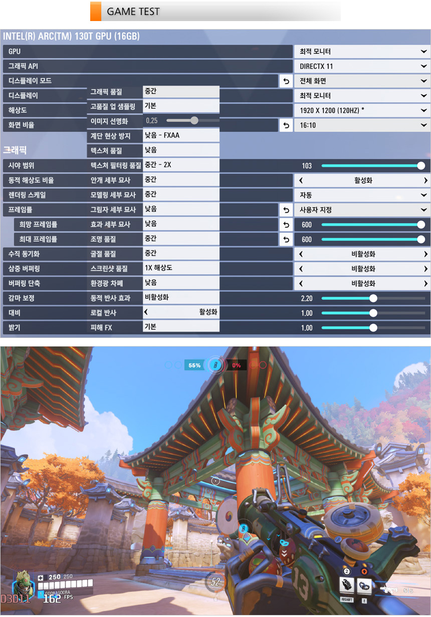 오버워치 2를 이용해 프레임 테스트 하고 있는 모습으로 WUXGA 해상도와 중간 옵션에서 124-170 프레임으로 플레이 되는 것을 확인할 수 있었다. 여유롭게 게임을 즐길 수 있을 것이다.