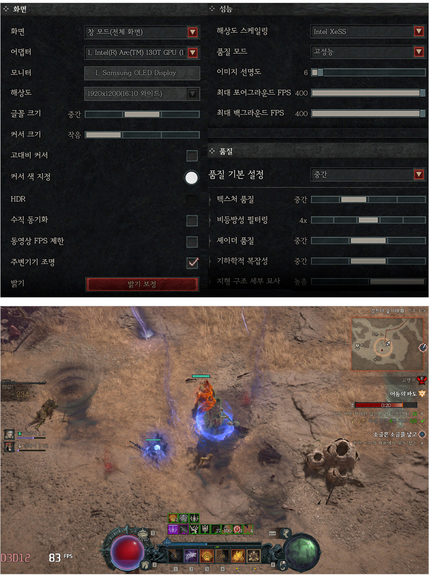 디아블로 4를 중간 옵션에서 실행하고 있는 모습으로 인텔 XeSS (고성능) 기술을 활성화 했을 때 70-84 프레임을 보여주어 부드럽게 게임을 즐길 수 있었다. 충분히 게이밍 용도로 활용할 수 있을 것이다. (16GB 메모리 탑재 모델대비 10 프레임 이상 상승했다.)