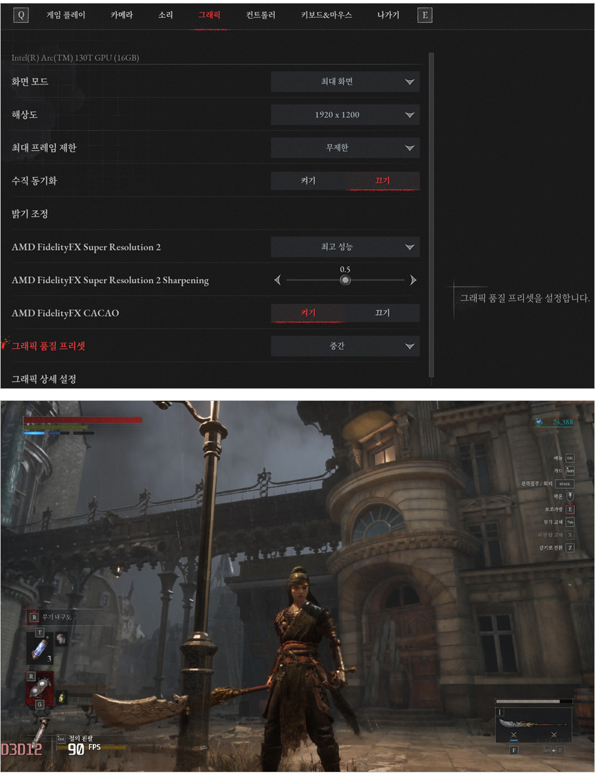 국산게임 P의 거짓을 중간 옵션에서 플레이 하고 있는 모습으로 FSR2를 최고 성능으로 설정했을 때 63-95 프레임을 보여주어 불편없이 게임을 즐길 수 있었다. (동영상을 참조하기 바란다.)