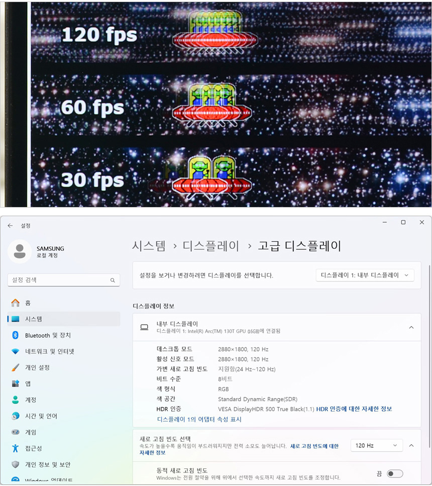 120Hz 주사율 지원으로 물 흐르듯 부드러운 영상을 즐길 수 있으며 영상에 맞게 주사율을 조정하는 가변주사율을 적용해 불필요한 배터리 소모를 최소화 할 수 있다. (가변 주사율 설정 뿐만 아니라 60Hz & 120Hz 고정도 가능하다.) 상단의 사진은 120Hz 주사율을 쉽게 인지할 수 있도록 하위 프레임과 같이 재생되는 영상 (960 Pixel Per Sec) 을 셔터스피드 1/20 로 촬영한 모습으로 프레임이 낮을수록 캐릭터의 수가 적으며 프레임이 높아질수록 시간당 많은 화면이 뿌려지기 때문에 캐릭터의 수가 많은 것을 확인할 수 있다.