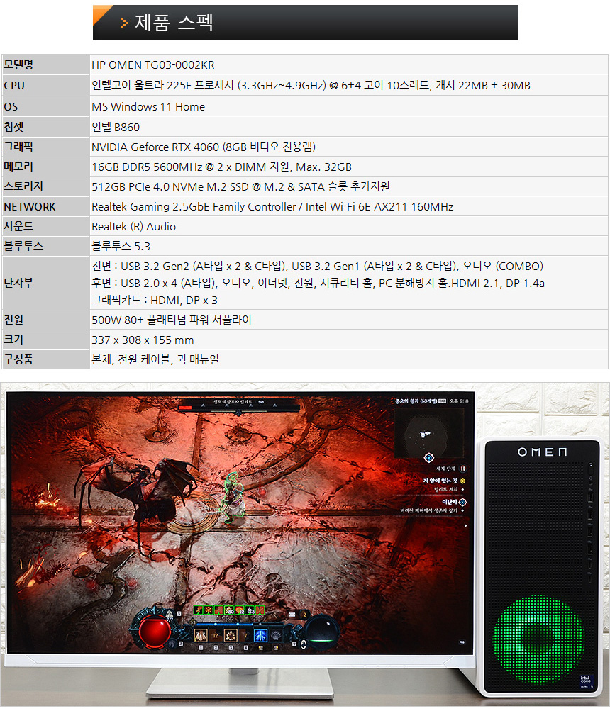 HP 온라인 공인 판매점인 지엘스토어 에서는 인텔코어 울트라 5 225F & RTX 4060 조합의 TG03-0002KR 뿐만 아니라 인텔코어 울트라 7 265F & RTX 4060 Ti 조합의 TG03-000KL 과 AMD 라이젠 7 8700F & RTX 4060 Ti 조합의 TG03-0001KL 모델도 판매하고 있다. 즐기는 게임이나 가격등을 고려해 제품을 선택하기 바란다.