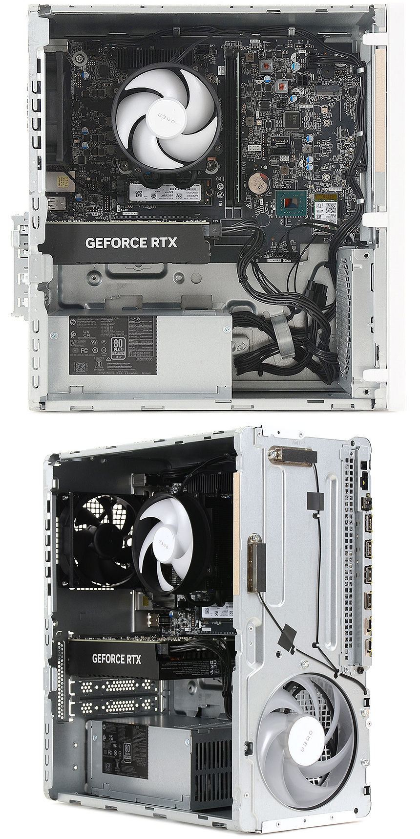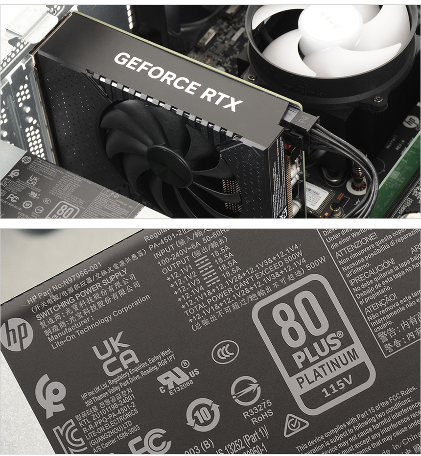 중앙부에 RTX 4060 그래픽카드가 장착된 것을 확인할 수 있으며 하단에는 80+ 플래티넘 인증으로 효율성을 높인 500W 파워 서플라이가 장착된 것을 확인할 수 있다. (80+ 인증을 받지 않거나 브론즈 등급의 파워서플라이를 사용하는 조립PC들과는 효율성이나 안정성에서 차이를 느낄 수 있을 것이다.