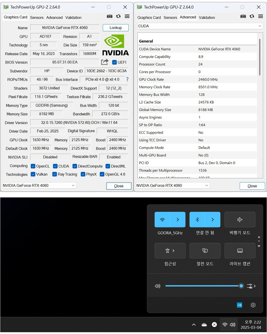 RTX 4060의 스펙을 확인하고 있는 모습으로 2460MHz 의 부스트 클럭으로 작동하며 8GB의 GDDR6 전용램이 설치된 것을 확인할 수 있다. 또한 인텔 Wi-Fi 6E 무선랜카드가 장착되어 빠른 무선속도를 즐길 수 있다. (유선랜을 사용할 경우 랜선이 있는 곳에서만 PC를 설치할 수 있는데 반해 이 제품은 장소에 제약없이 원하는 장소에 설치해 사용할 수 있다.)