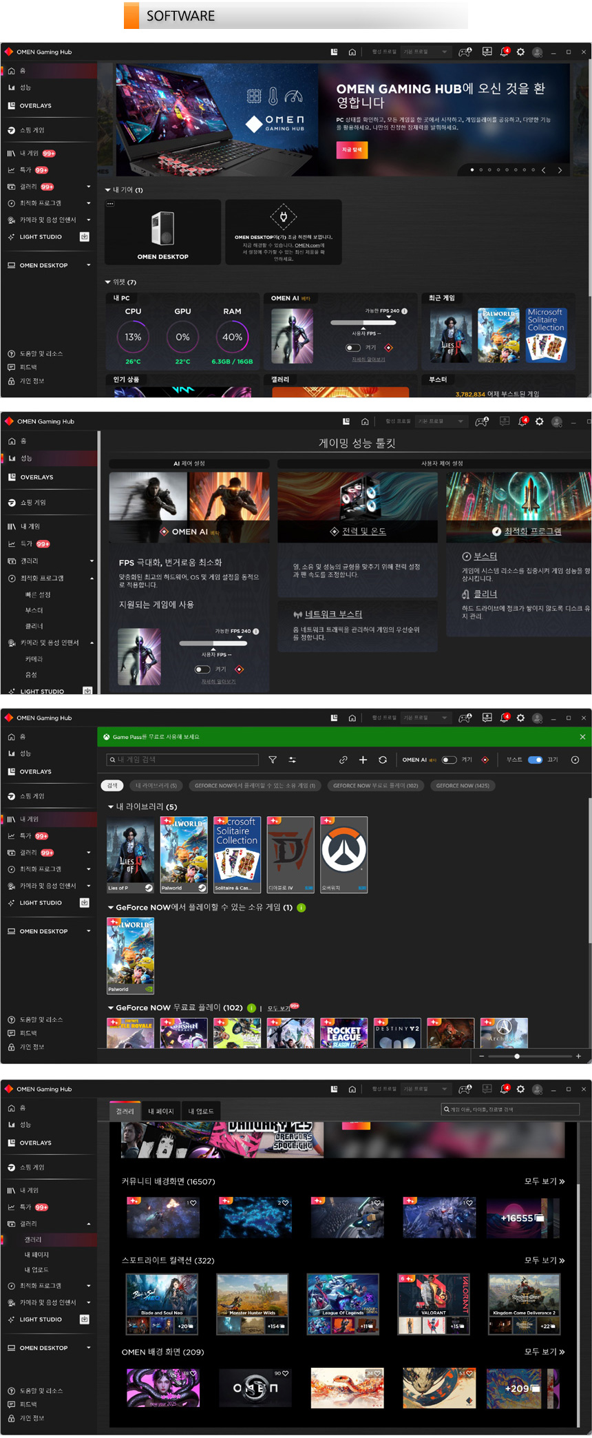 HP 게이밍 PC와 노트북의 사용성을 한층 높여주는 오맨 게이밍허브의 실행 모습으로 다양한 기능을 메인화면에서 실행하거나 CPU와 GPU 사용율 등을 모니터링 할 수 있도록 구성된 것을 확인할 수 있다. 게이밍 성능을 높일 수 있는 메뉴가 별도로 구성되어 있어 편하게 PC를 셋팅할 수 있으며 라이브러리 메뉴가 제공되어 설치한 게임들을 편하게 실행할 수 있다. 또한 갤러리 메뉴가 별도로 제공되어 배경화면을 손쉽게 교체할 수 있다.