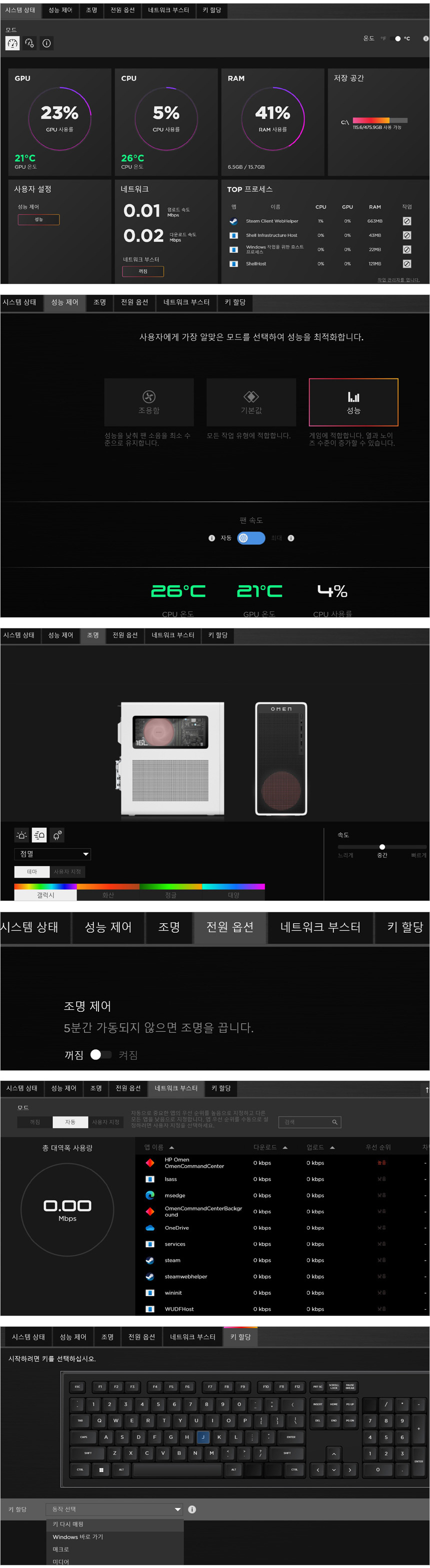 제품을 선택해 세부메뉴에 들어온 모습으로 디테일한 시스템 모니터링이 가능하며 퍼포먼스와 팬속도 등을 원하는 대로 지정할 수 있다. 또한 디자인 부분에서 언급한 것과 같이 조명 효과를 설정할 수 있으며 절전기능과 네트워크 부스트, 키보드 맵핑 기능을 제공한다.