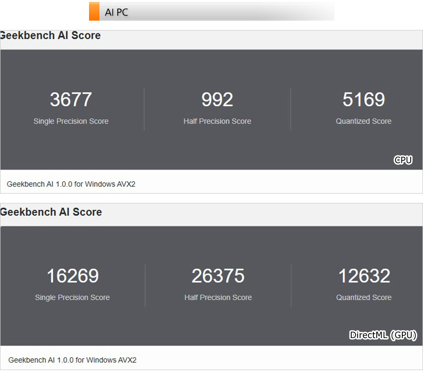 이 제품은 NPU가 탑재된 인텔의 최신 프로세서를 탑재했을 뿐만 아니라 RTX 4060 그래픽카드도 장착되어 다양한 AI 애플리케이션을 편하게 활용할 수 있다. 상단의 사진은 긱벤치 AI를 이용해 성능을 확인하고 있는 모습으로 사무용 PC나 구형PC 대비 스코어가 상당히 높은 것을 확인할 수 있었다.