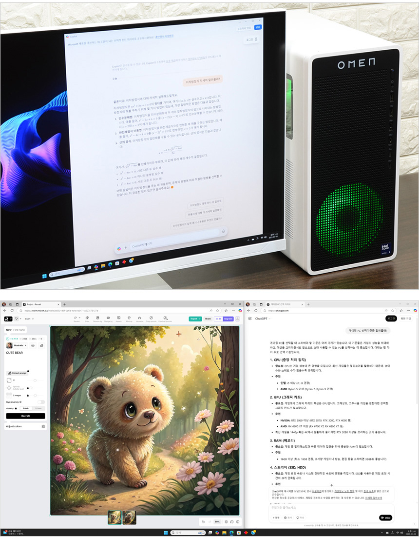 또한 많은 유저들이 사용하고 있는 Chat GPT도 실행해 보았는데 원활하게 작동했으며 이미지 생성형 AI인 ReCraft 도 실행했는데 빠르게 텍스트를 이미지로 만들어 주었다. (말씀드린 부분 뿐만 아니라 포토샵 등에서 지원하는 AI 기술등도 편하게 사용할 수 있다.)