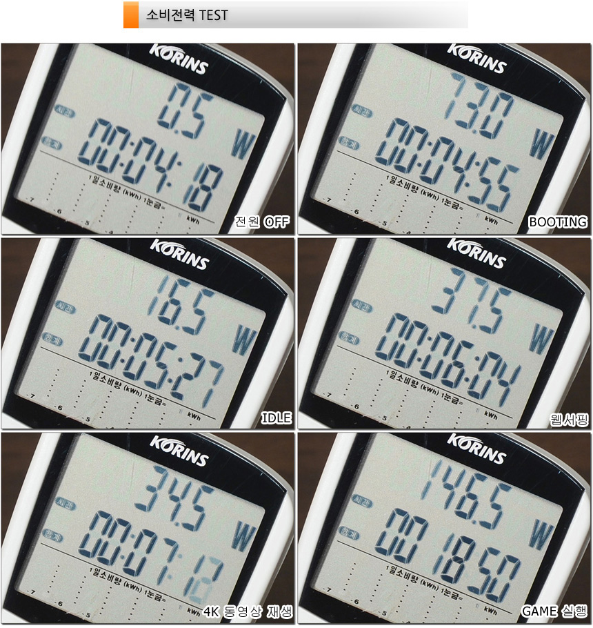 소비전력 테스트를 진행하고 있는 모습으로 (최고성능 모드) 캐주얼한 작업에서는 50W 이내의 낮은 소비전력으로 작동했으며 의 움직임이 상당히 컷다. 게임에서는 200W 까지 소비전력이 올라가는 것을 확인할 수 있었다. (대부분의 게임에서 140~180W 사이의 소비전력을 보여주었다.) @ 300W를 넘어갔던 구형 모델들과 비교해 소비전력이 확연히 낮아진 것이 인상적이다.