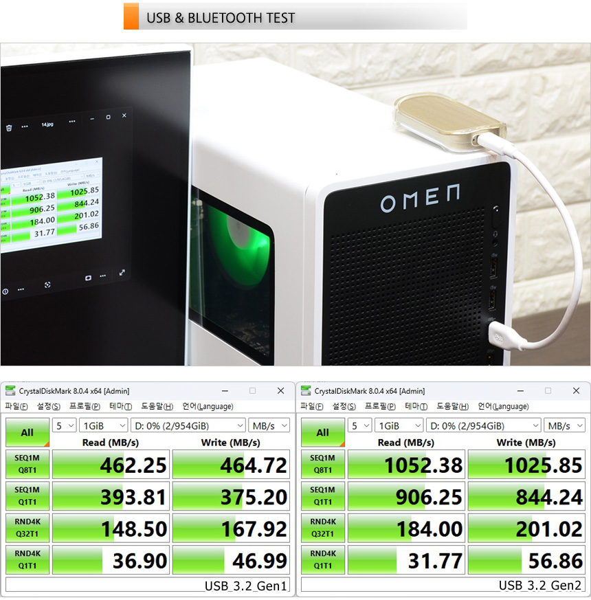 PC 전면에 USB 3.2 Gen2 단자를 지원해 빠른 데이터 전송이 가능하다. 상단의 사진은 USB 3.2 지원 외장 SSD를 이용해 속도 테스트를 진행하고 있는 모습으로 USB 3.2 Gen1과 확연히 비교되는 빠른 속도를 보여주었다.