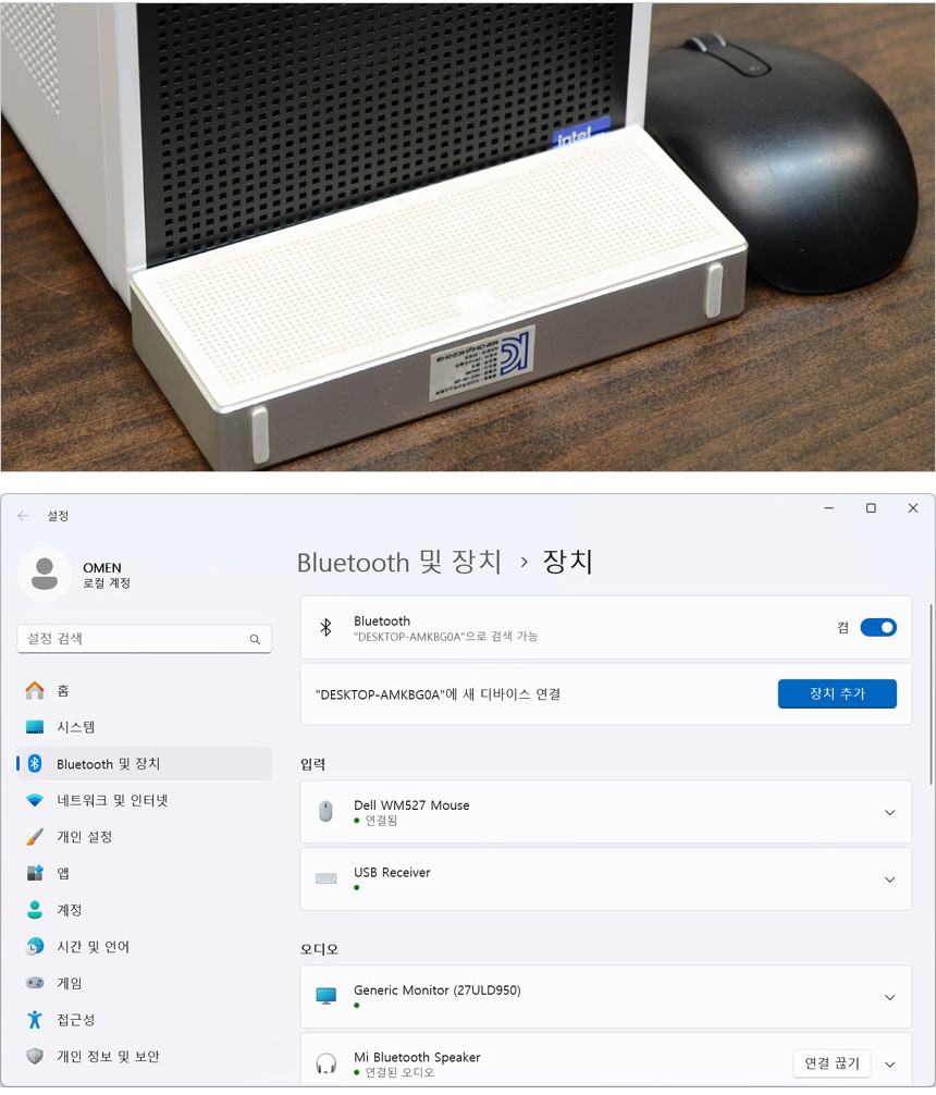 테스트를 위해 책상에 PC와 모니터 (27형)를 설치한 모습으로 캄펙트 모델답게 많은 공간을 차지하지 않았다. 집이나 사무실의 책상 공간이 협소 하더라도 편하게 설치해 사용할 수 있을 것이다. (무게도 가벼워 편하게 들고 이동할 수 있다.)