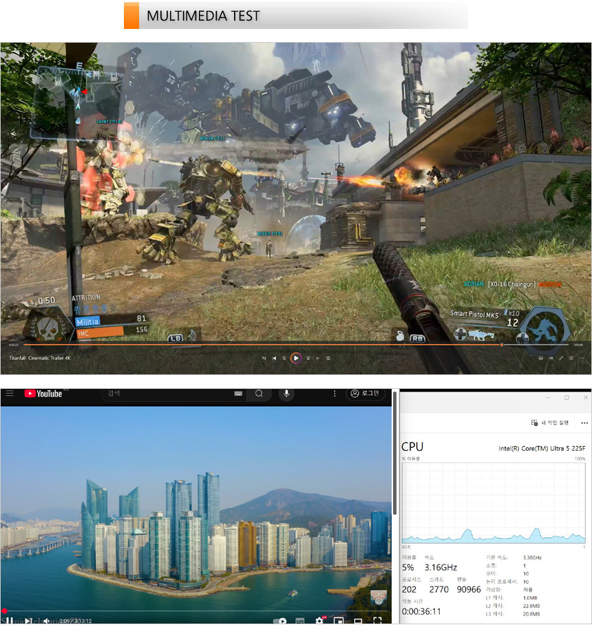 4K 동영상을 이용해 멀티미디어 테스트를 진행하고 있는 모습으로 고성능 게이밍PC 답게 부드럽게 재생되는 것을 확인할 수 있었다. 유튜브 4K 동영상이나 고화질 영상을 즐길때 성능으로 인한 부족함은 느끼지 않을 것이다. 또한 유튜브 고화질 동영상을 이용해 CPU 점유율을 테스트 해 보았는데 (2160P@60FPS) 5-17% 대의 점유율을 보여 주었으며 인터넷을 실행했을 때 30% 중반까지 점유율이 올라가는 것을 확인할 수 있었다.